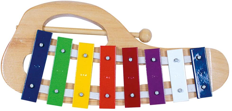 - mit 8 Klangplatten aus Metall in Regenbogenfarben und Holz-Schlägel extra für kleine Kinderhände.