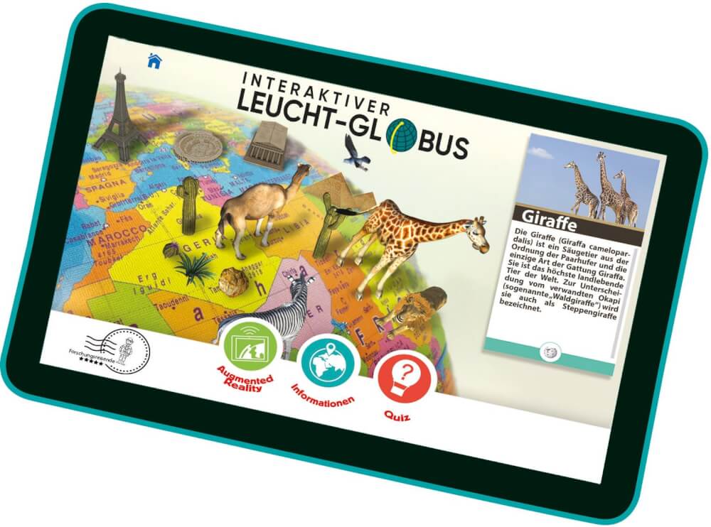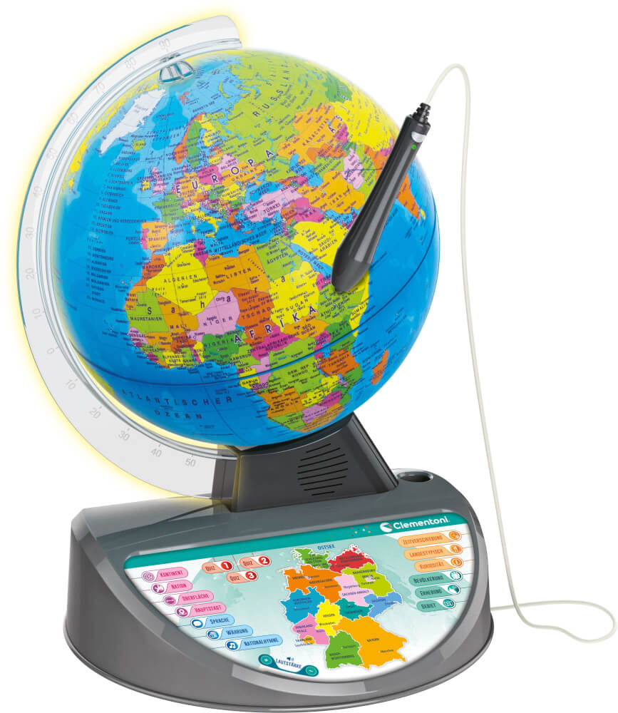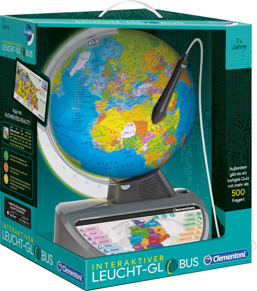 Ein völlig neues Design für diese schöne interaktive Weltkarte mit optischem Stift. Der transparente Bogen leuchtet auf, wenn der Globus an ist! Kinder können die Welt entdecken und mehr über Kontinente, Länder, Hauptstädte, Oberflächen, Bevölkerungsgruppen, Währungen, Sprachen, Gebiete, Höhen, Zeitunterschiede und weitere interessante Fakten erfahren. Mit mehr als 500 Fragen in 3 verschiedenen Schwierigkeitsstufen kann man das erworbene Wissen testen. Das Lernen wird dank des neuen Designs, der hervorragenden Audioqualität und mehr als 3 Stunden informativer Audioinhalte, interessanter Fakten und Musik aus der ganzen Welt einfach faszinierend. Dank der neuen kostenfreien App erfahren Kinder ein erhöhtes Realitäts-Erlebnis. Wenn die Weltkarte durch ein Tablet oder Smartphone betrachtet wird, kann das Kind Tiere, Denkmäler und verschiedene Kulturen sehen.