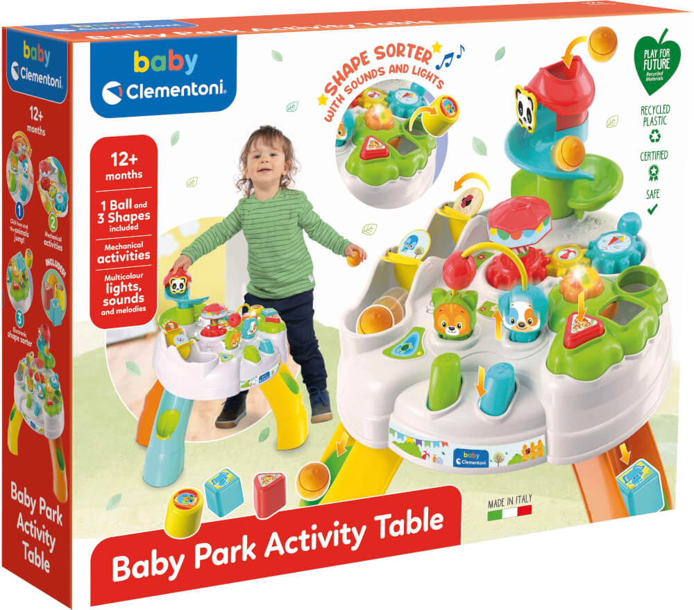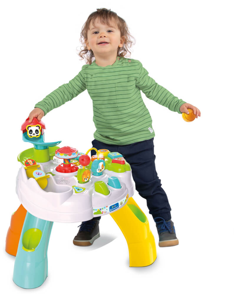 Ein umfangreicher, interaktiver und elektronischer Spiel-Tisch inmitten der unterhaltsamen Welt der Themenparks. Enthält viele Aktivitäten: Der Formenbereich ist interaktiv mit Lichtern und Geräuschen, die Zahnräder drehen sich, und die Figuren bewegen sich, wenn die Tasten gedrückt werden. Beinhaltet eine unterhaltsame Bahn mit Bällen und Rutschen, die in den Füßen des Tisches endet. Regt manuelle Fähigkeiten, visuelle Wahrnehmung und das Erkennen der Ursache-Wirkungs-Beziehung an.