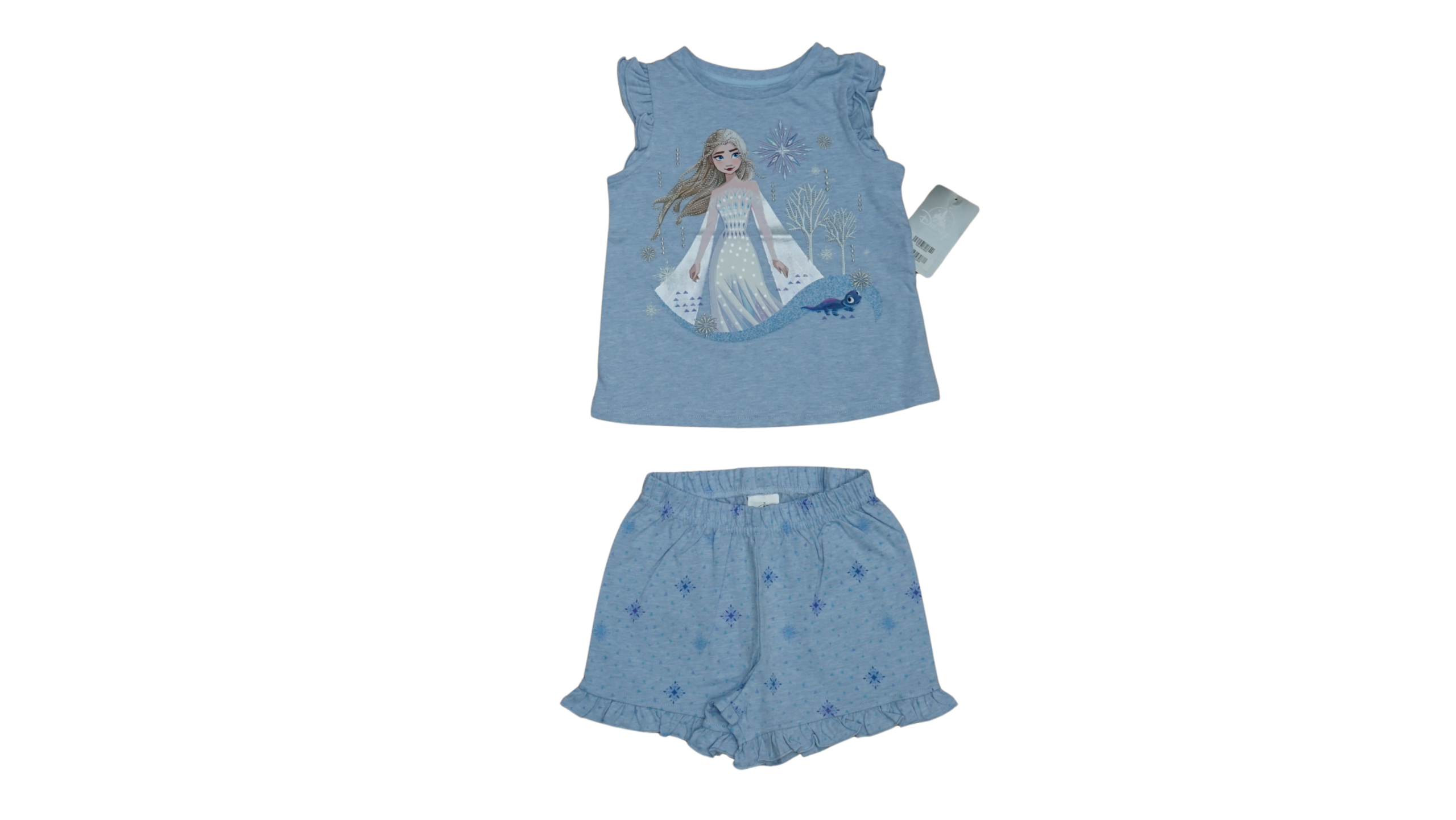 Dieses Disney Frozen Mädchen Sommer-Set bringt frischen Eiszauber in den Alltag kleiner Prinzessinnen. Das 2-teilige Outfit besteht aus einem hellblauen Ärmellosen Shirt mit zarten Rüschen an den Schultern und einem großen Frontprint von Elsa aus „Die Eiskönigin 2“, verziert mit funkelnden Schneeflocken-Details. Dazu passend gibt es eine leichte Shorts mit elastischem Bund und Allover-Schneeflockenmuster, abgerundet durch verspielte Rüschen am Saum.