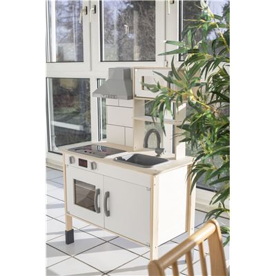 Machen Sie die leckersten Gerichte in dieser schönen Holzspielküche von Eichhorn. Die Küche ist mit einer Extraktorhaube, einem Wasserhahn, einem Waschbecken, einem Ofen und einem Keramikherd ausgestattet, das wirklich Licht verleiht. Drehen Sie die Tasten und Sie hören Sound.