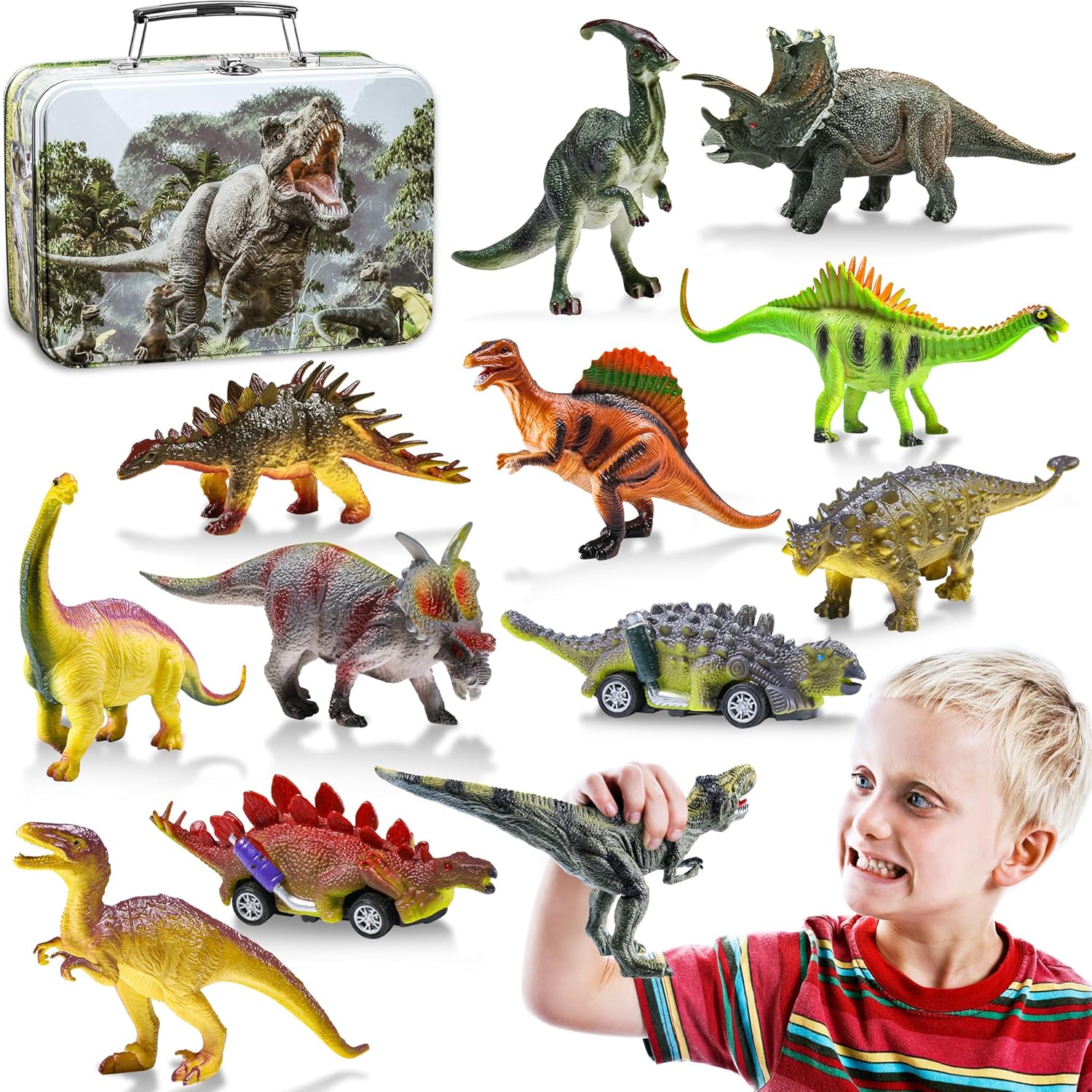 [Qualität und Menge]: Unsere Kinderdinosaurierspielzeuge enthalten zehn 6,5-7,5 Zoll große Dinosaurierfiguren, zwei Dinosaurier-Driftautos, zwei kleine Bäume und eine Eisendose. Jedes Dinosaurierfiguren besteht aus hochwertigen Materialien, damit Kinder bedenkenlos spielen können und Eltern beruhigt sind.