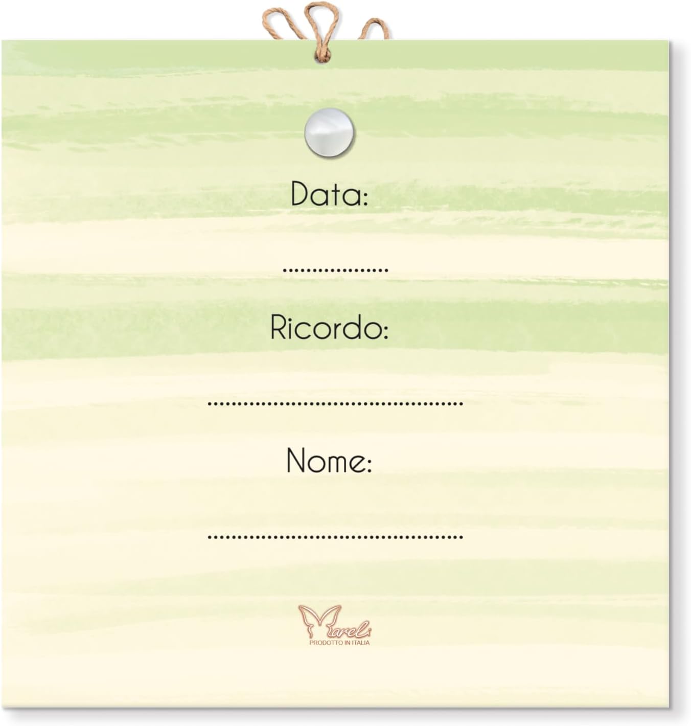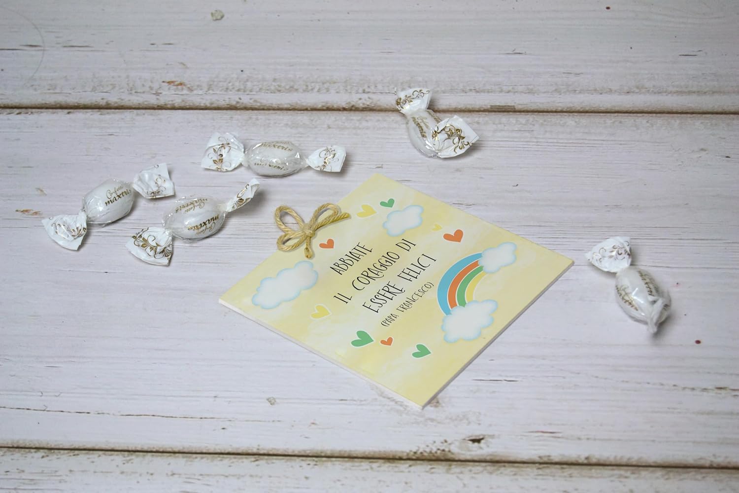 Set mit 4 Karos 10 x 10 cm, aus weißem Karton und in 4 verschiedenen Designs bedruckt; auf der Rückseite kann der Name des Geburtstagskinds und das Datum der Zeremonie mit Stift beschriftet werden. Das Bild hat einen Magneten auf der Rückseite und kann an Metalloberflächen (z. B. Kühlschrank, Regal usw.) aufgehängt werden oder an der Wand (wie ein Bild) mit Jutekordel an die Wand gehängt werden. Die Struktur der Karos besteht aus weißem Karton, Maße 10 x 10 cm, Dicke 3 mm. Die Karos sind eine originelle Idee als Gastgeschenk zur Taufe, Erstkommunion oder Konfirmation der Kinder. Der Artikel wird vollständig in Italien hergestellt. Das Set enthält 4 Karos, die in einer Packung verpackt sind und keine Dragees oder anderes Zubehör enthalten.