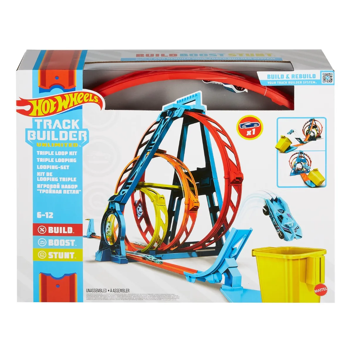 Das Hot Wheels Track Builder Unlimited Looping-Set bietet unendlich viele Möglichkeiten – Kinder können ihrer Fantasie freien Lauf lassen und individuelle Tracks und Stunts bauen!