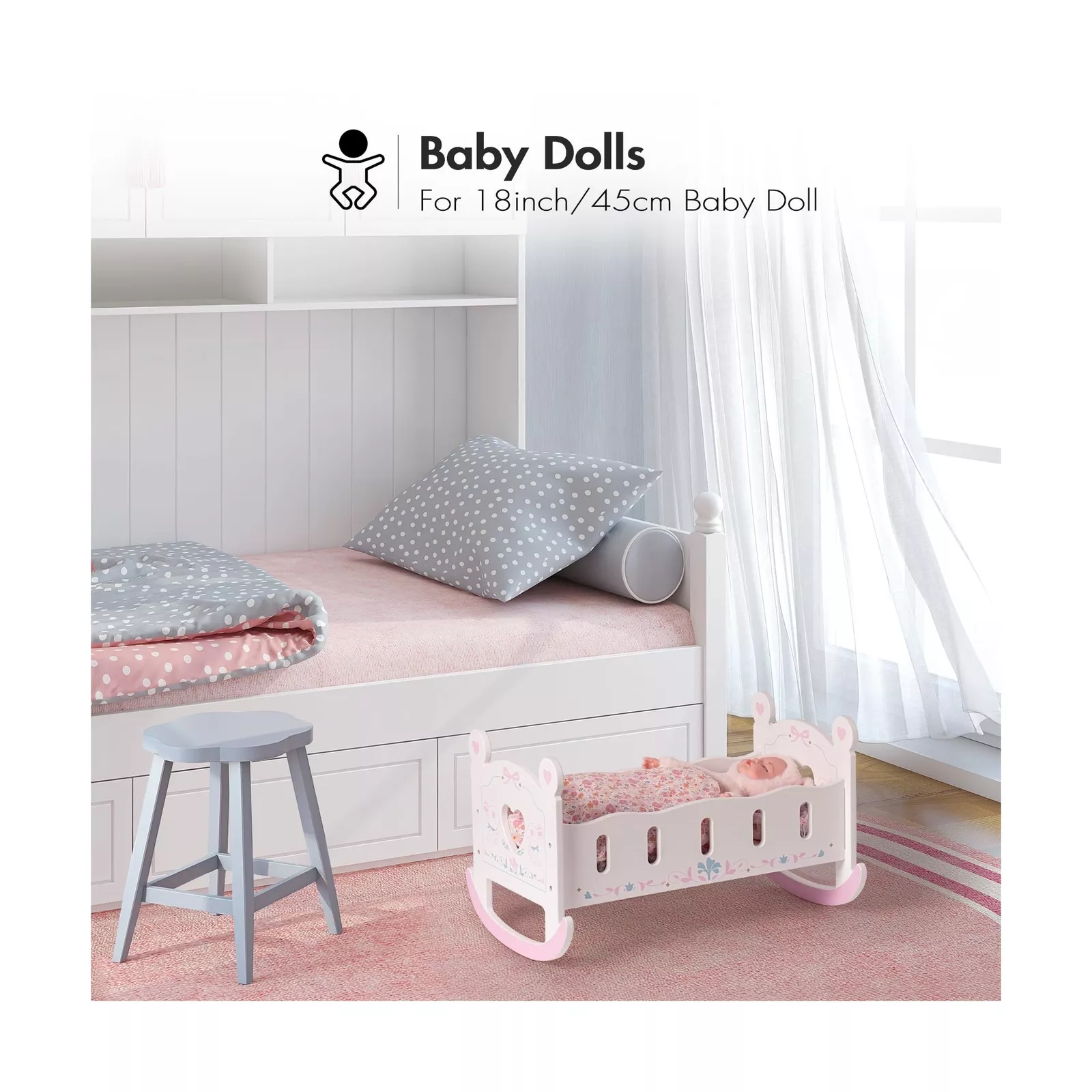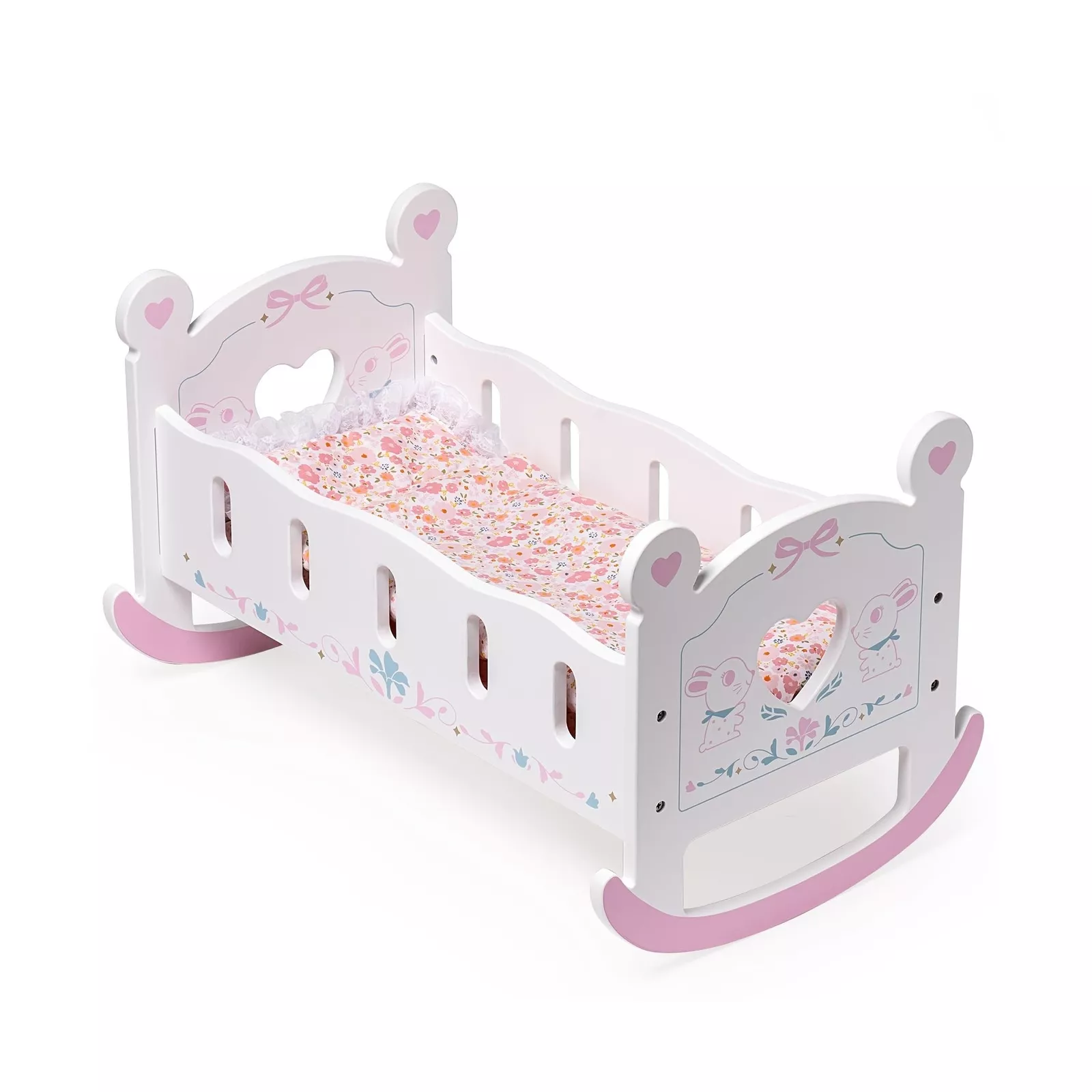 Brandneues ROBOTIME Spielzeug-Babypuppenbett für 18-Zoll-Puppen, Puppenwiege aus Holz mit rosa Polster, Decke und Kissen, Geschenk für Kinder ab 3 Jahren