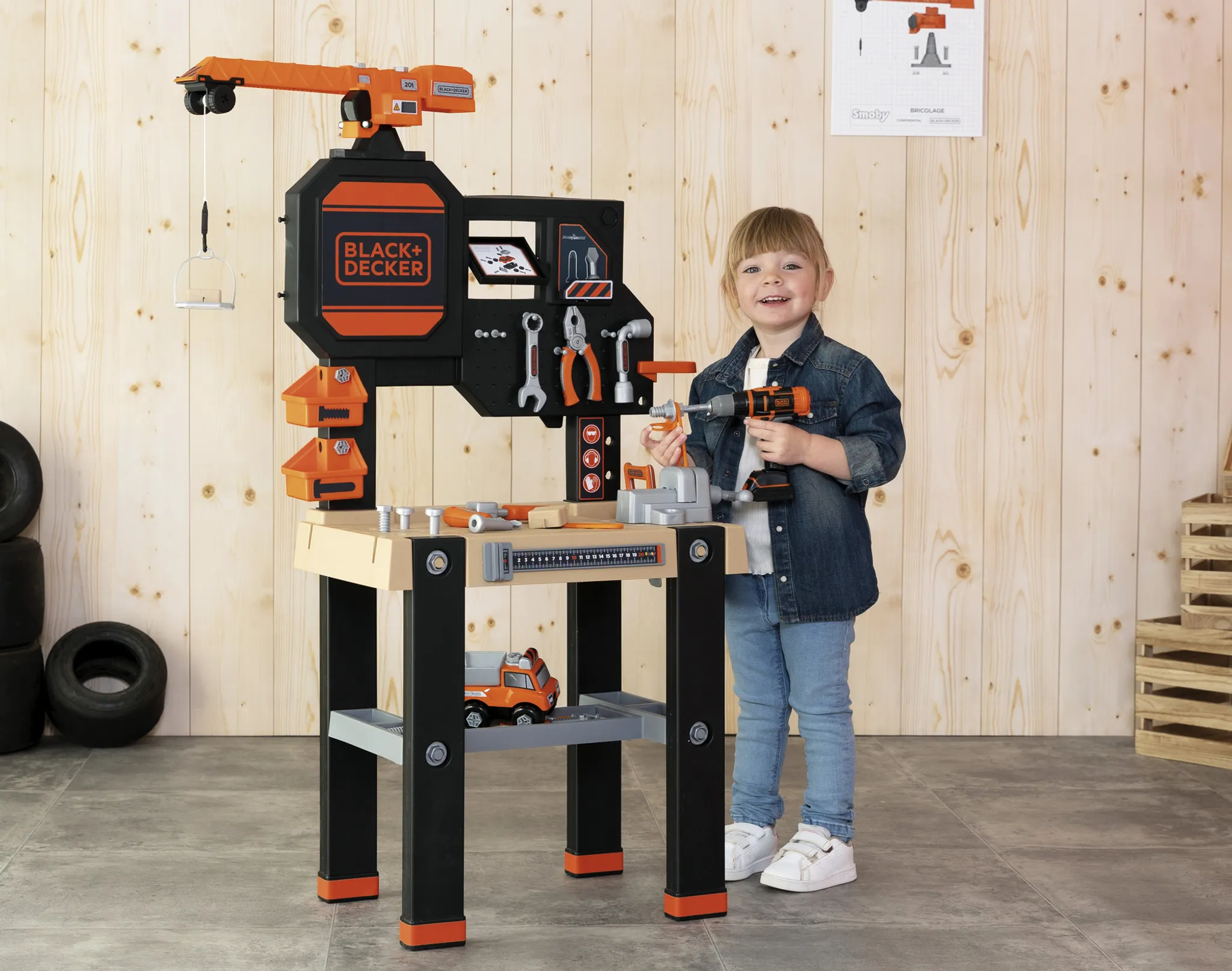 Das große und stabile Smoby Werkbank-Center im Original-Design der bekannten Heimwerker-Marke Black+Decker sieht aus wie die echte Werkbank von Papa. Ausstattungs-Highlight der Werkbank ist der schwenkbare Kran, der je nach Größe des Kindes entweder auf der Arbeitsfläche oder oben auf der Rückwand angebracht werden kann. Die Befestigung erfolgt ganz einfach durch die mitgelieferten großen Kunststoffschrauben. In der detailreichen Werkstatt können kleine Handwerker spielerisch Hämmern, Bohren, Schrauben und Sägen und gleichzeitig die unterschiedlichen Werkzeuge kennenlernen. Die große Arbeitsfläche in Holzstruktur und die zahlreichen Ablagefächer bieten jede Menge Platz für das umfangreiche Zubehör. Neben einem mechanischen Akkuschrauber gibt es Hammer, Radschlüssel, Schraubendreher, Schraubschlüssel, Zange und Säge sowie eine große Schraubzwinge und ein verschiebbares Lineal an der Vorderseite. Für viel Spielspaß sorgt auch die lustige Nagel-Funktion: schlage auf einen Nagel, und ein anderer kommt heraus! Mit dem Konstruktions-Bausatz können kleine Mechaniker mit nur wenigen Handgriffen ein echtes Auto zusammenbauen. Ergänzt wird die spielstarke Ausstattung durch Schrauben, Muttern, Nägel und diverse Befestigungsmaterialien. Erweiterbar und kompatibel mit allen Black + Decker Werkzeugen von Smoby. Produktmaße (LxBxH): 82 x 34 x 117 cm. Altersempfehlung: geeignet für Kinder ab 3 Jahren.