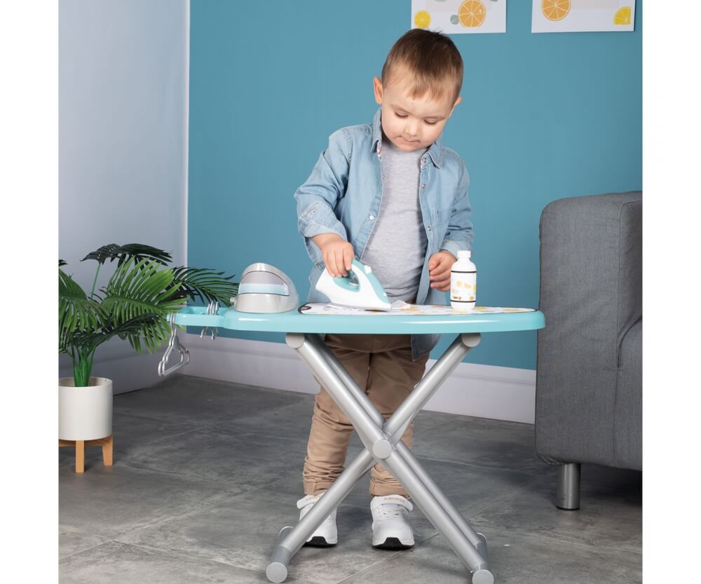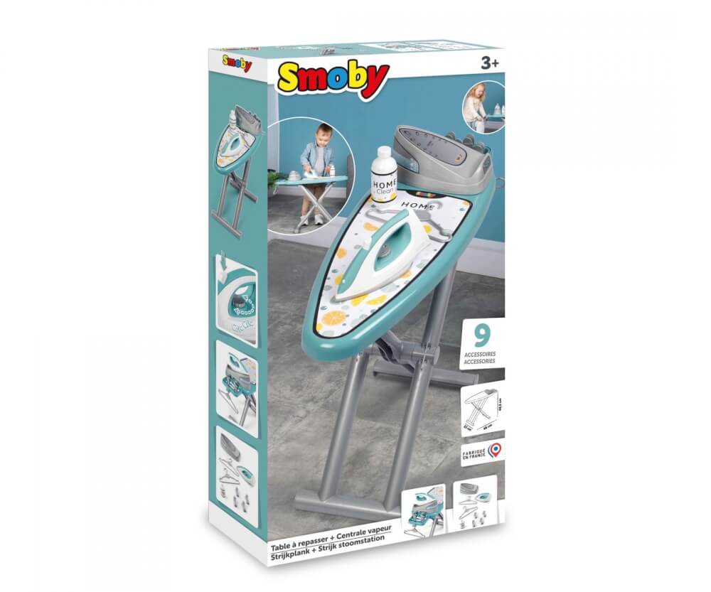 Smoby Bügelbrett mit Dampfstation, inkl. Bügeleisen mit mechanischem Drehknopf, 2 Kleiderbügeln, 4 Wäscheklammern und Flasche. Ab 3 Jahren.