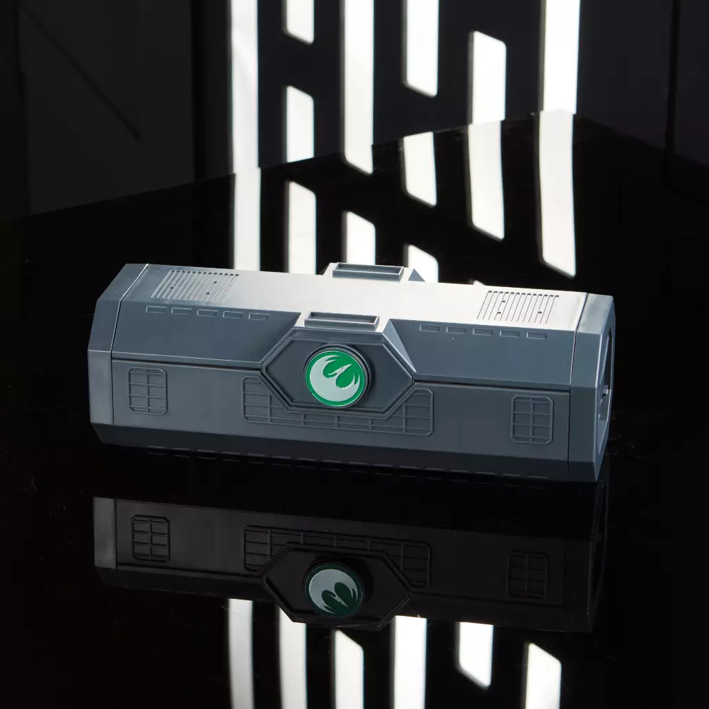 Drücken Sie den Schalter am Griff, um LICHTSCHWERT-Geräusche zu aktivieren und eine anbringbare LICHTSCHWERT-Klinge grün aufleuchten zu lassen (separat erhältlich).