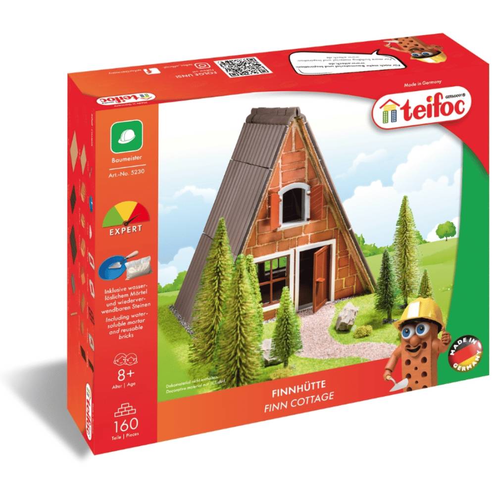 Die teifoc Finnhütte ist mit ihren 160 Bauteilen ein wunderbares Projektgeschenk für Kinder ab 8 Jahren und bastelfreudige Erwachsene. Der Steinbaukasten 5230 gehört in die Produktgruppe „Baumeister“ und wird mit dem Schwierigkeitsgrad „Expert“ fortgeschrittenen Anwendern empfohlen. Steinbaukasten-Neulinge in dieser Altersgruppe sollten die Unterstützung ihrer Eltern erhalten, denn gemeinsam macht es doppelt so viel Spaß. Zudem fördert dies bei den Kindern ein „Wir“-Gefühl, lässt sie eine kreative Gemeinschaft aufbauen und stärkt ihre sozialen Fähigkeiten.