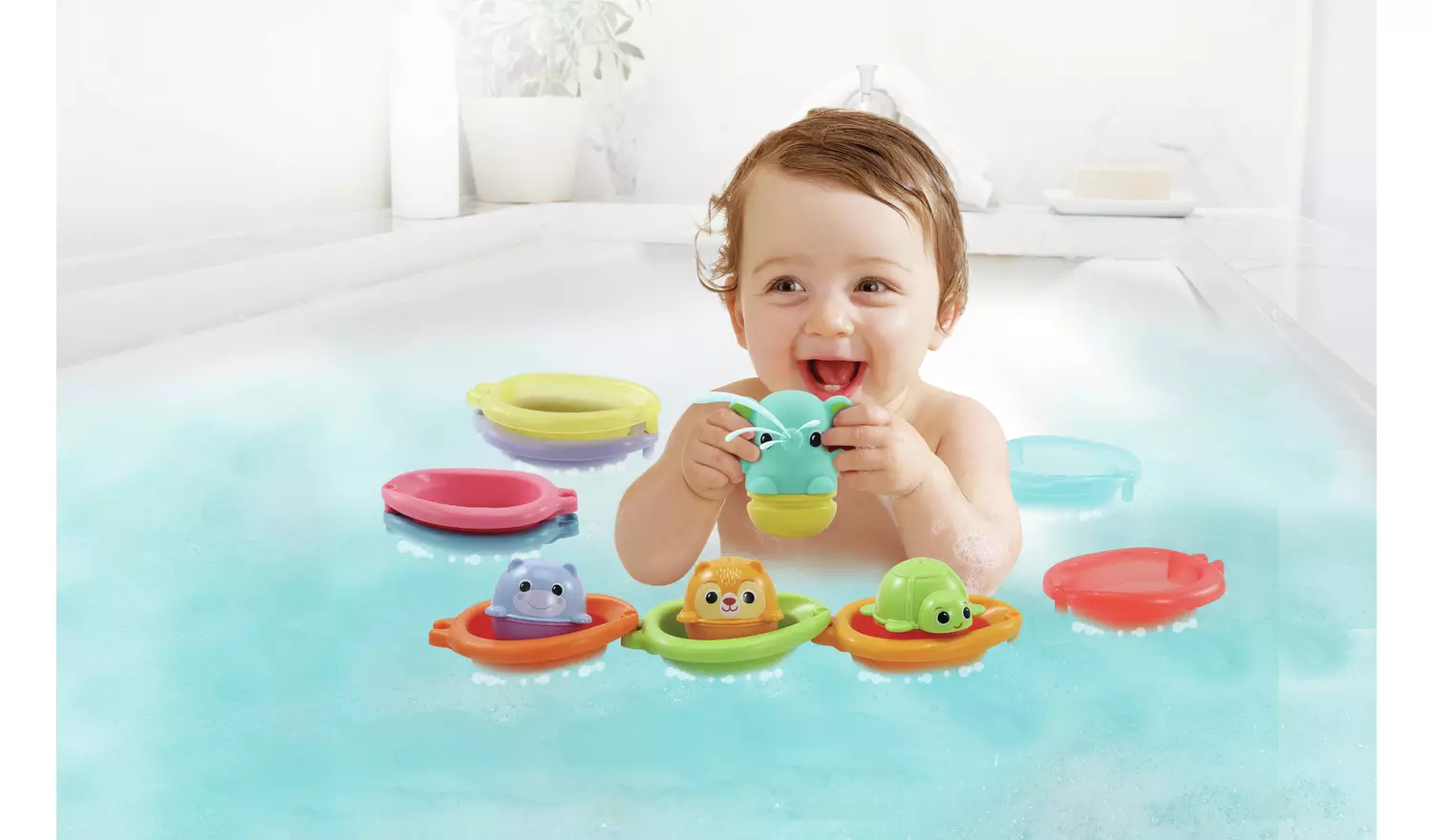 Neun bunte Boote können miteinander verbunden oder gestapelt werden, und drei Tierbecher zum Schöpfen und Ausgießen. Verbinden Sie die Boote und setzen Sie die Tiere hinein, um schon früh Spaß beim Rollenspiel zu haben.